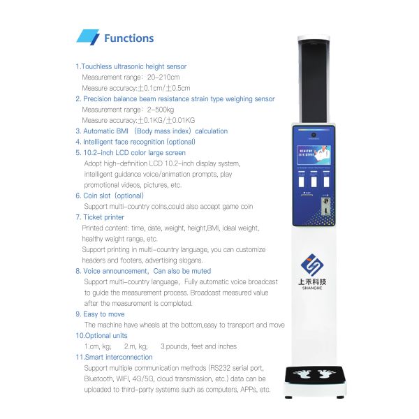 SH-V5 model is one of Face Recognition scales. The basic function for this model weight, height, Body Mass Index. The highlight for the product is that It has a large 10.2 inch LCD touch screen which can display measurement result, advertising videos and pictures, etc. Owners can set Coin operated measurement and coin number for once. It's the best choice for a quick health checkup for public, and suitable for public advertising.