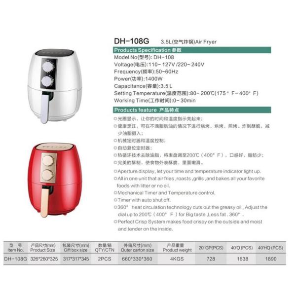 Non Stick 3.5L Air Fryer Oil Free Manual 1400W Electric Rapid Heating
