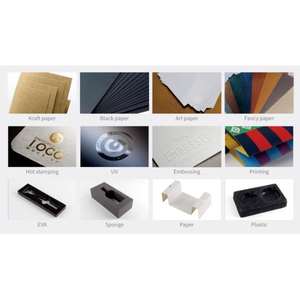 | Paper Inside | 1.Material:Grey board, White paperboard,mdf wood, Plastic 2.Thickness:hard paperboard(800gsm,900gsm,1000gsm,1100gsm, 1200gsm,1400gsm,1600gsm).(Make suggestion according your size of box) |